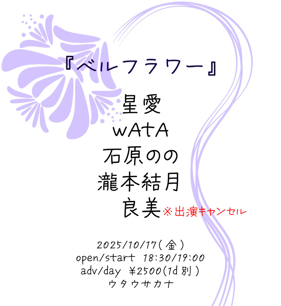 『ベルフラワー』 SCHEDULE 2025/10/17(金) 歌う魚 OPEN 18:30/STAR 19:00 🗣:星愛/wAtA/石原のの/瀧本結月 adv/day ¥2500(1d別) 星愛はトリ 21:00〜🎸 無料配信 URLをコピーする 報告する