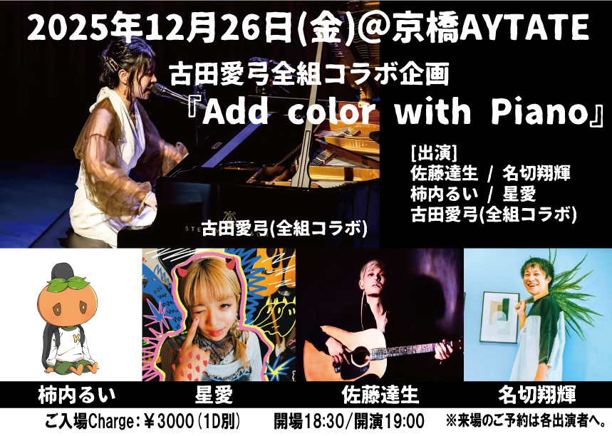 『Add color with Piano』 SCHEDULE 2025/12/26(金) 京橋AZYTATE OPEN 18:30/START 19:00 星愛/佐藤達生/名切翔輝/柿内るい/古田愛弓(全組コラボ) ADV/DOOR¥3000(1D別) 初めてのピアノコラボ!素敵な日になりそう👀✨お取り置きお待ちしてます!! お取り置きフォーム URLをコピーする 報告する
